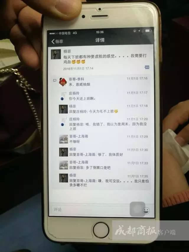 從楊菲生前發的朋友圈也不難看出,工作,是他生活的主要組成部分。11 月 1 日下午,楊菲曾發朋友圈說,"每天下班都有種要虛脫的感覺,我需要打雞血。"