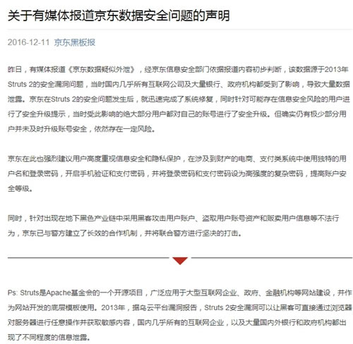 京東在12月11日凌晨發表聲明,稱該數據源于2013年Struts 2的安全漏洞,已經完成修復。