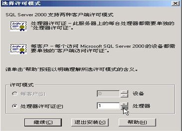 第10步:在“選擇許可模式”窗口,根據您購買的SQL SERVER2000軟件的類型和數量輸入。“每客戶”表示同一時間最多允許的連接數,“處理器許可證”表示該服務器最多能安裝多少個CPU。例如可選擇“每服務器1個處理器”。企業版和標準版時客戶許可設備數可以修改,個人版時0,您不能修改。